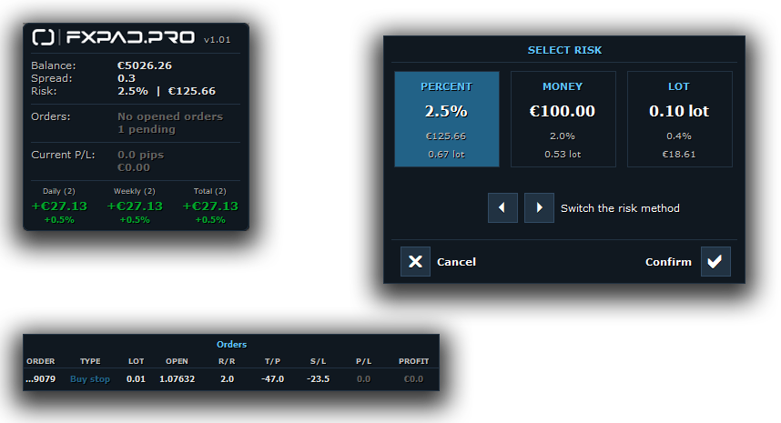 Instantly configure risk management with options for percentage, fixed amount, or lot-based calculations.